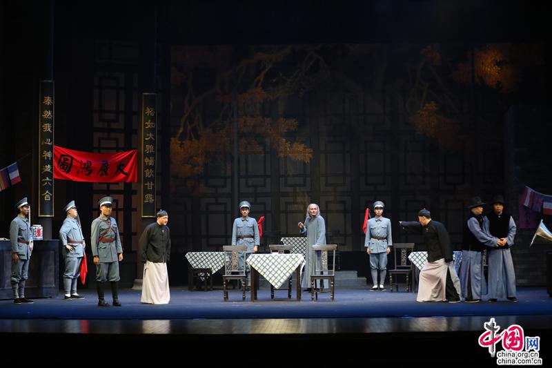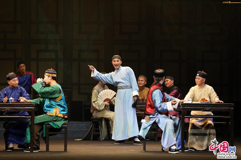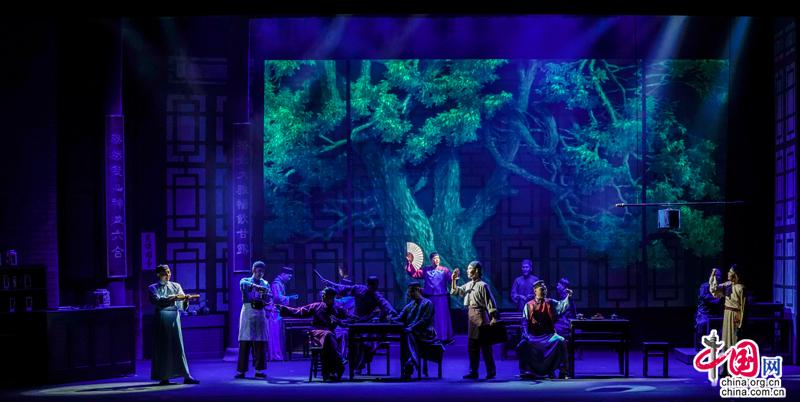 全剧在特色乐器三弦的引领下,缓缓拉开大幕——众多茶客的合唱、轮唱、对唱中唱出了清末京城茶馆的氛围,勾勒出形形色色茶客的面貌,令观众转瞬沉浸于老北京大茶馆的热闹兴旺的市井气氛,起到先声夺人的效果。