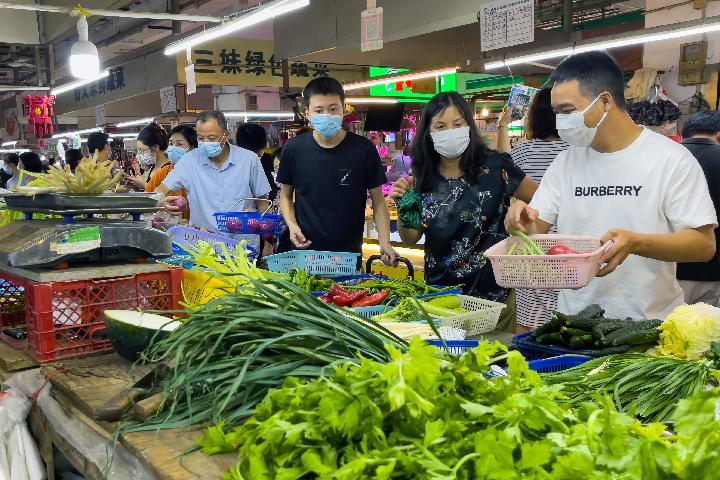 市民在四川省成都市一家菜市场内购买蔬菜等生活物资。新华社记者 沈伯韩 摄