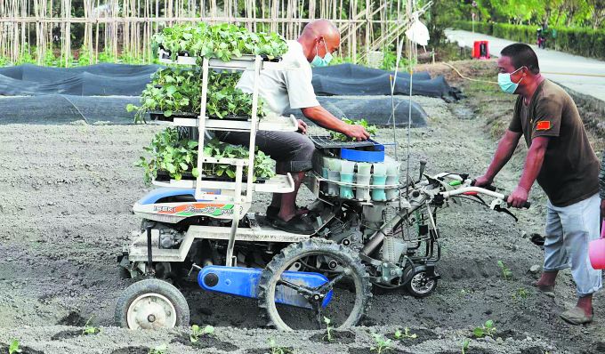 ▲蔬菜移栽机轻快推进,栽下了整齐的菜苗
