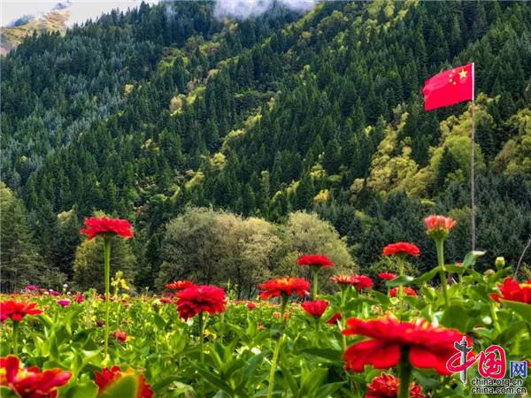 山顶白雪皑皑,山间彩林满坡,山下百花齐放,美丽的达古冰川等待与你的相遇。(志武 图片由达古冰山景区提供)