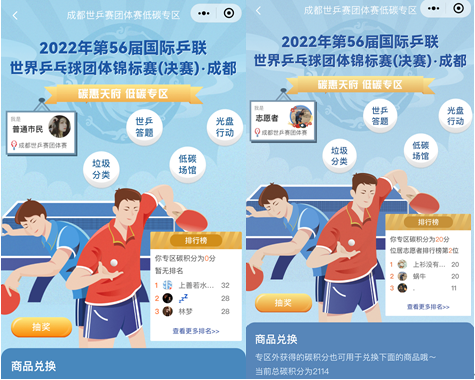 “碳惠天府”小程序近期已正式上线成都世乒赛团体赛专区,市民打开“碳惠天府”小程序,通过首页入口即可快速进入专属页面,所有用户均可参与“碳惠天府”知识问答、垃圾分类、光盘行动等低碳活动打卡,并利用参与活动所获得的碳积分兑换普惠商城商品与福利。