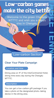 为激励提升全民低碳素养,使成都世乒赛团体赛成为实施绿色低碳办赛的践行者、助推低碳生活的倡导者、积极应对气候变化的参与者,“低碳办赛·让城市更美好”系列活动陆续上新,诚邀运动员、志愿者、市民等各类人群参与互动打卡。