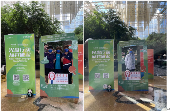 在运动员、技术官员、嘉宾及服务人员等入驻的酒店内,就餐区的每个动线节点都能见到“光盘行动”提示牌,一句中英双语的温馨提示总能让人在取餐前再斟酌一下,各国嘉宾也纷纷在“光盘行动”互动装置前打卡。
