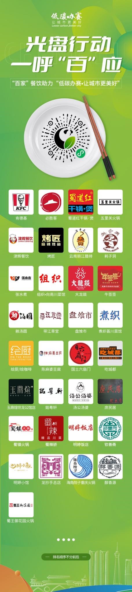 闭环外,全市“百家”餐饮商家纷纷主动参与活动,在自家门店专门设立了“光盘行动”宣传点位,并借助门店的客流影响力及自有资源,邀请就餐市民参与“光盘行动”。全市商家正在通过自己的方式践行成都世乒赛团体赛“低碳办赛”理念。