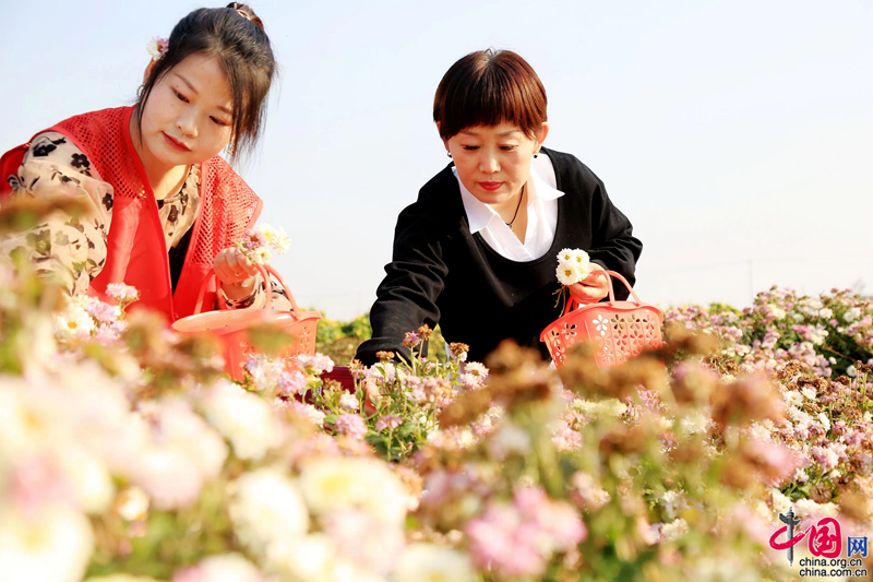 “目前,百草园里的菊花已经到达盛花期,我们组织村民进行采摘,带动附近村民就业同时,土地租金、菊花销售等也能增加农户和村集体经济收入。”双沟镇秋歌农业发展有限公司副经理赵峰说。