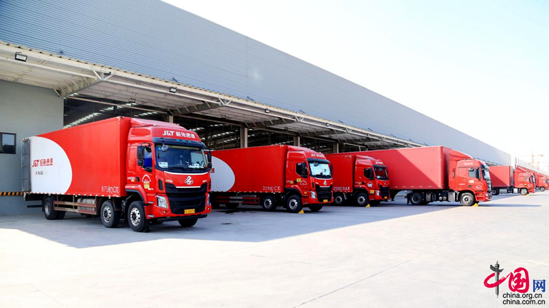 在产业园区内,一辆辆“极兔快递”物流车不时进进出出,一片繁忙的景象,在物流基地仓储中心货车停靠在一侧的装货平台,货物通过伸缩皮带机“跑”上智能分拣线,再由高速扫码机识别货物编码将货物分类,最后通过不同的支传输带,运送到相应的后道口。如此一来,不仅分拣速度更快,精确度也更高。