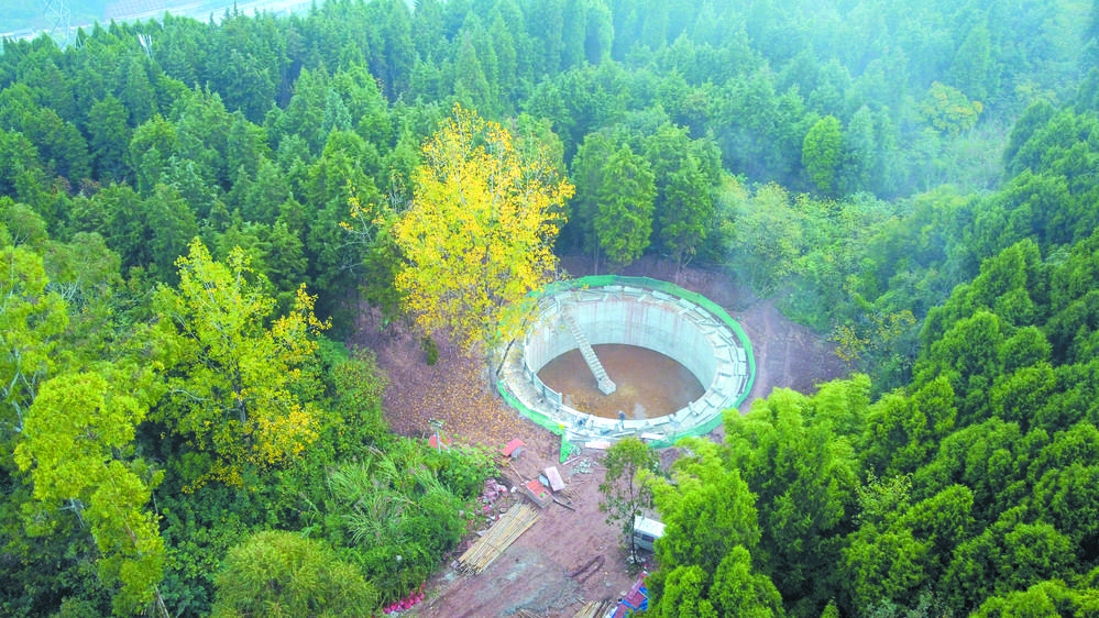记者留意到,蓄水池深约5米,呈圆柱形,四周和底部都用混凝土加固,并修建一处可供人走到池底的楼梯,“用混凝土加固主要是为了防止水渗透出去。”施工人员说,投用后,蓄水池就可以接纳、储蓄龙泉山雨季的雨水和溪水、泉水,到季节相对干燥的时候,工作人员就能够将蓄水池的水抽出来,用于灌溉周围的林木。