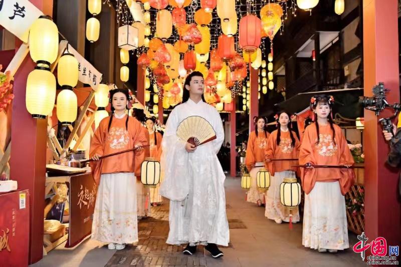 夜幕下,万盏宫灯初燃,东风夜放花千树。越过文殊坊园区浓郁汉唐风格的门头,换上华裳,游客仿佛来到不夜锦官城,共赴一场千年之约,穿越之旅。在身着唐、宋、明不同时期的汉服迎宾队伍导引下,游客移步异景,在这里感受着千年文化历史创造出的风华绝代、形态各异的华裳汉服之美和国风艺术之美。