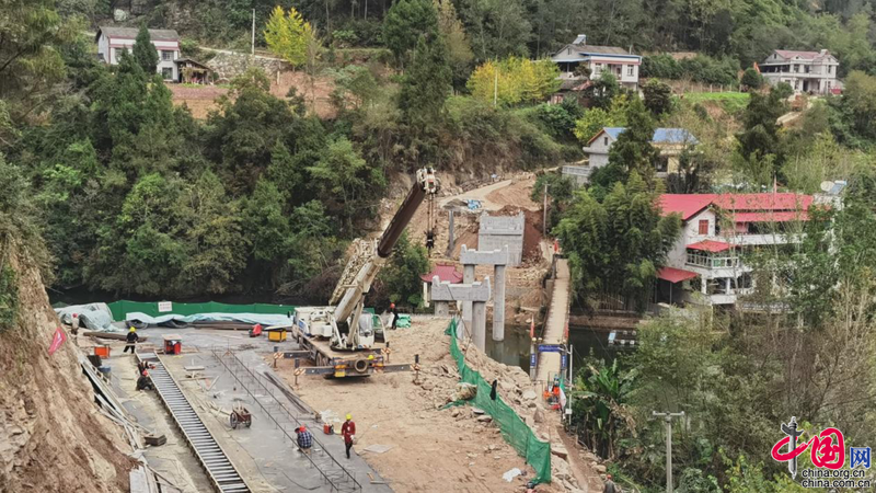 11月7日立冬,川北山区有些小冷。机器轰鸣、焊花四溅、车辆进出……四川苍溪县龙山镇三角塘铁索桥改公路桥建设现场热火朝天。