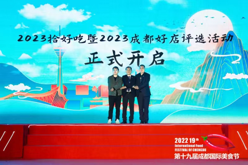 在2023新菜品发布秀结束后,温江、金牛作为区(市)县代表上台与美食协会领导共同介绍2023拾好吃评选活动与2023成都好店评选活动。介绍结束后,三位在主持人的邀请下共同按下屏幕,开启2023拾好吃暨2023成都好店评选活动。