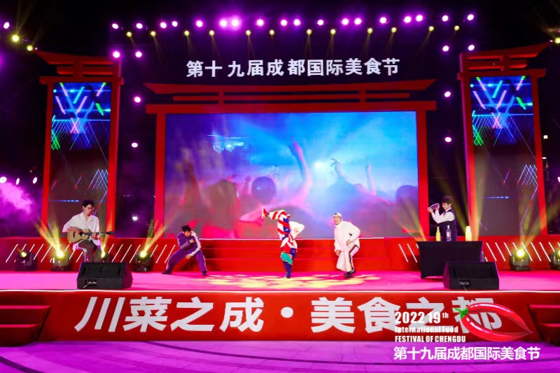 “穿越古今,寻味巴蜀”沉浸歌舞秀,一曲原创歌曲《穿越古今,寻味巴蜀》和古今人物对话的演出为现场嘉宾和观众带来了一场和而不同,美美与共,穿越千年的盛世画卷。值得一提的是,今年夏天冲上热搜的“肖家河爱心冰柜”故事也搬上了本届开幕式的荧幕,再现了2022年夏天成都餐饮人主动为社会尽一份力的责任心,也记录了政府职能部门积极为商家排忧解难,社会各界齐心协力、互帮互助的感人经历。“爱心冰柜”的主人赵春艳夫妇说:“大家一起传递爱心真的很感动,爱心冰柜见证了成都爱心的传递。”