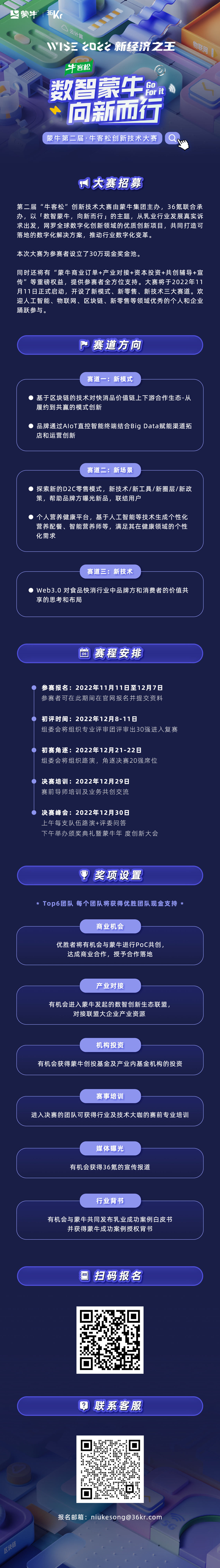本次大赛由蒙牛集团主办、36氪联合承办,大赛将继续围绕“数智蒙牛·向新而行”的主题,与全球优秀创业者共同打造行业创新解决方案。第二届“牛客松”创新技术大赛还将着力打造蒙牛数字化创新联盟,聚焦全产业链数字化转型,持续打造消费品行业数字创新生态圈。