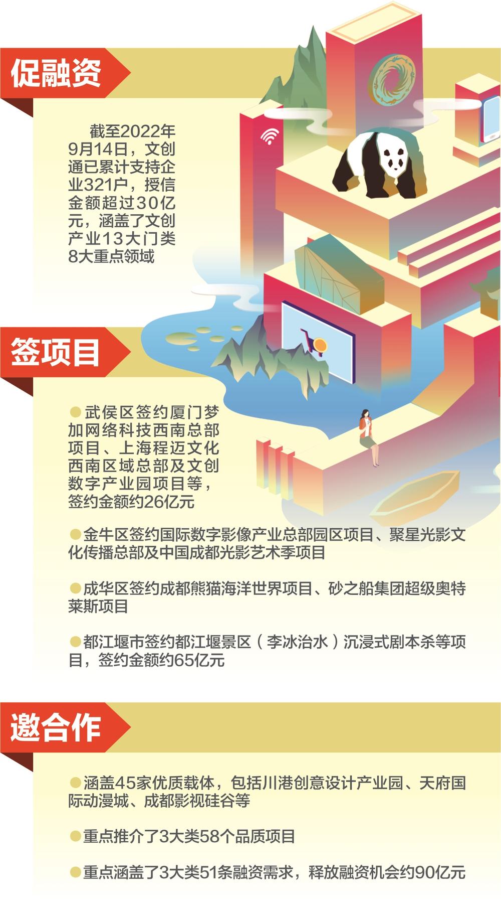 在产融对接会活动中,成都文创通项目负责人对文创通政策进行了详细宣讲。文创通平台以成都优质文创企业为服务对象,运用“政银”和“政银担”的成熟合作模式,帮助企业解决融资难、融资贵问题。“截至2022年9月14日,文创通已累计支持企业321户,授信金额超过30亿元,涵盖了文创产业13大门类8大重点领域。”该负责人透露。