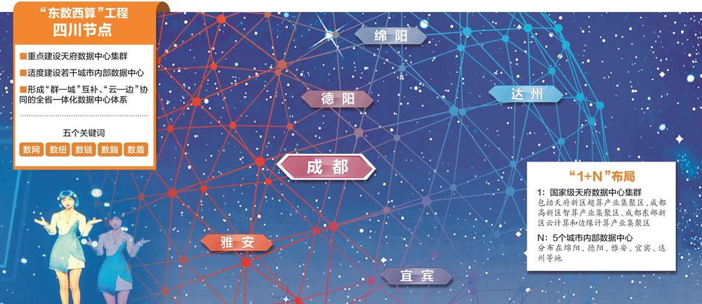 从建设布局来看,简单地说就是“1+N”,“1”是指国家级天府数据中心集群,具体包括天府新区超算产业集聚区、成都高新区智算产业集聚区,以及成都东部新区云计算和边缘计算产业集聚区;“N”是指5个城市内部数据中心,分布在绵阳、德阳、雅安、宜宾、达州等地。据悉,四川同时承担“东数”和西算”双重任务,而“数网”“数纽”“数链”“数脑”“数盾”是具体实施的5个关键词。