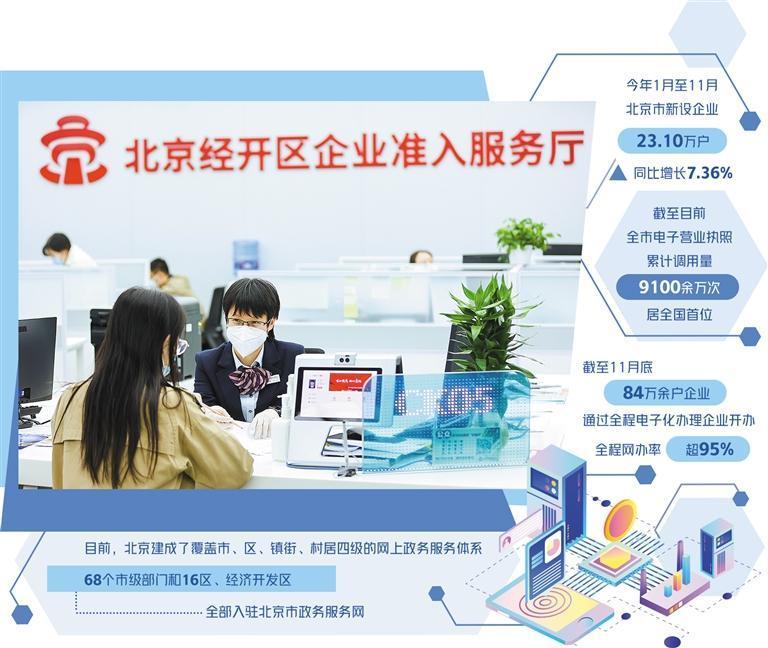 有这样一组数据,展示了京华大地的市场活力:今年1月至11月,北京市新设企业23.10万户,同比增长7.36%;截至目前,全市电子营业执照累计调用量9100余万次,居全国首位;截至11月底,84万余户企业通过全程电子化办理企业开办,全程网办率超95%……