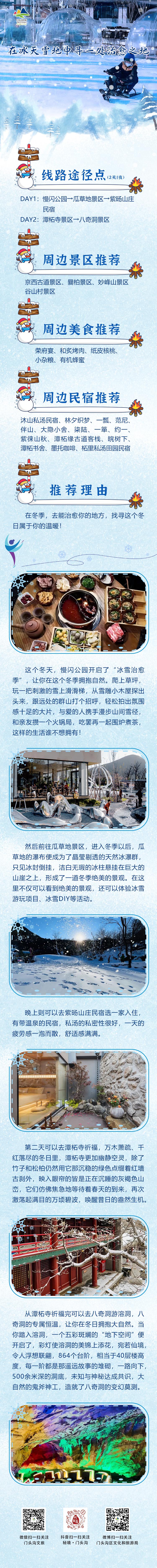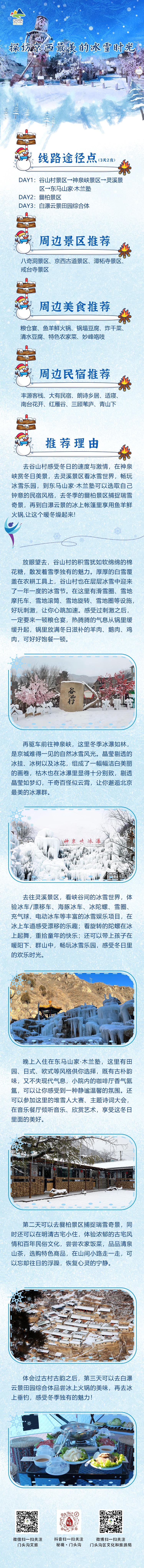 游京西山水,享冬季美景,永定河畔,风光旖旎,重峦叠嶂,白雪皑皑,门头沟的冰雪美景渐入佳境,为推动文旅行业复工复产,扩大文旅消费升级,提振文旅企业发展信心,延续“后冬奥”冰雪旅游热度,在元旦、春节来临之际,北京市门头沟区文化和旅游局以“紫气东来 冰雪京西”为主题,紧抓冬季山地冰雪旅游区域特色,加强文旅农商体深度融合,全力整合谷山村、灵溪、神泉峡、瓜草地、慢闪公园、东马山家、白瀑云景等景区、民宿、田园综合体冰雪、冰瀑、冰雕、美食特色资源及活动,打造“鱼羊鲜火锅”“粮仓宴”等冬季暖身滋补养生美食,加大冬季旅游产品供给,策划推出了2条冬季冰雪精品线路,线路涵盖门头沟冬季冰雪、民宿、美食、民俗等文化旅游资源,吸引广大游客到门头沟区住小院、堆雪人、赏雪景、泡汤、观山、静心,感受“京西旅游过大年”的民俗风情,领略门头沟别样的大好河山。