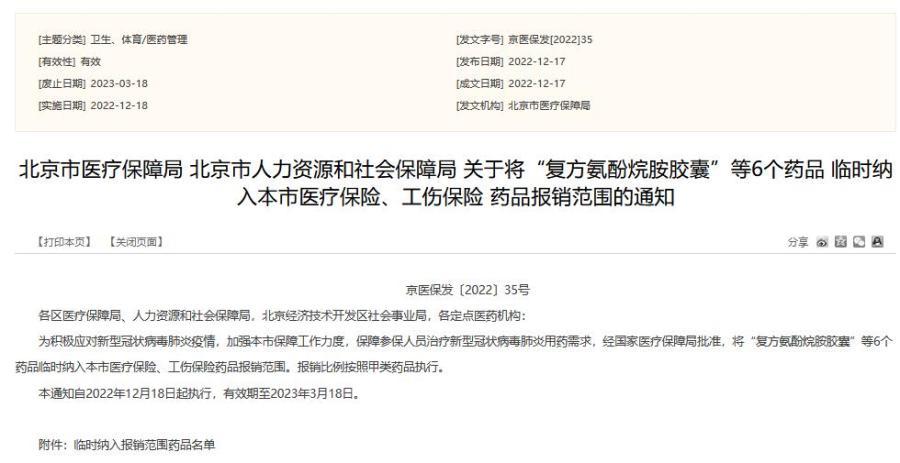北京市医疗保障局网站2022年12月17日发布消息,为积极应对新型冠状病毒肺炎疫情,加强北京市保障工作力度,保障参保人员治疗新型冠状病毒肺炎用药需求,经国家医疗保障局批准,将复方氨酚烷胺胶囊、复方氨酚甲麻口服液、小儿氨酚黄那敏颗粒、氨咖黄敏胶囊、氯芬黄敏片、氨溴特罗口服溶液6个药品临时纳入北京市医疗保险、工伤保险药品报销范围。报销比例按照甲类药品执行。通知自2022年12月18日起执行,有效期至2023年3月18日。