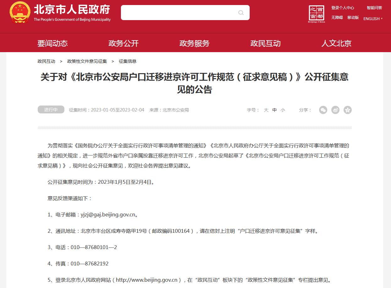 首都之窗网站刊登公告,对《北京市公安局户口迁移进京许可工作规范(征求意见稿)》公开征集意见。