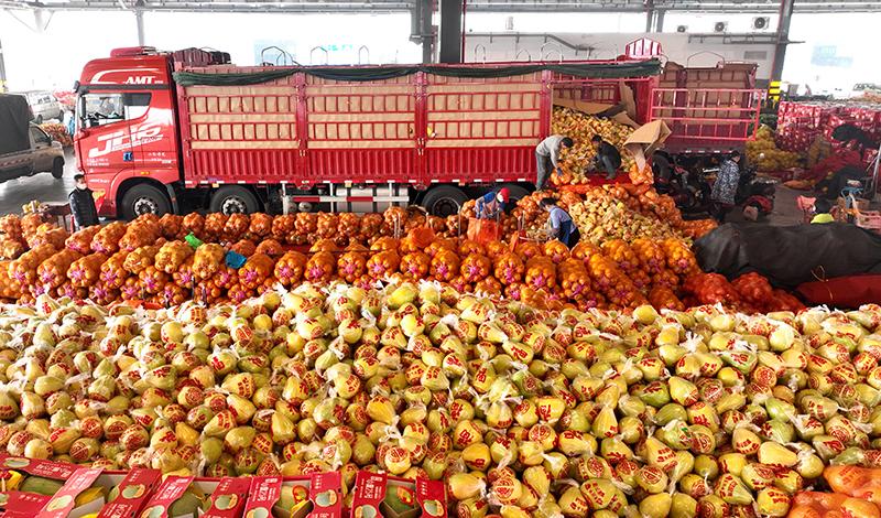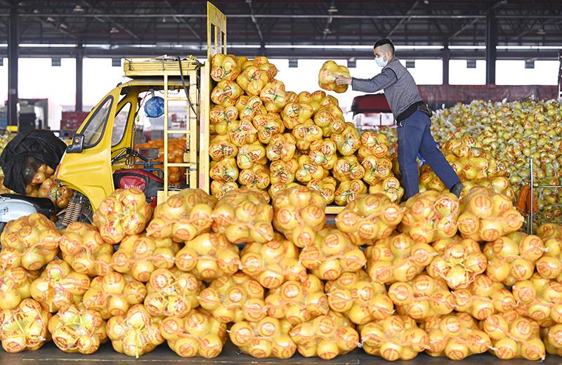 1月9日,在广西柳州一家农产品批发市场水果交易区,工人装运水果。