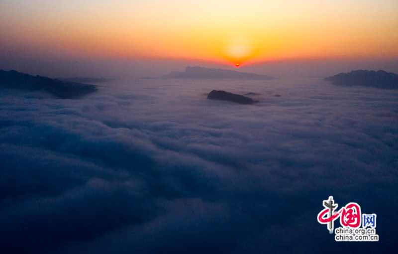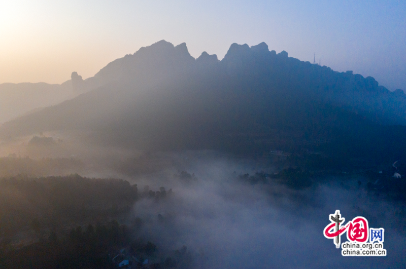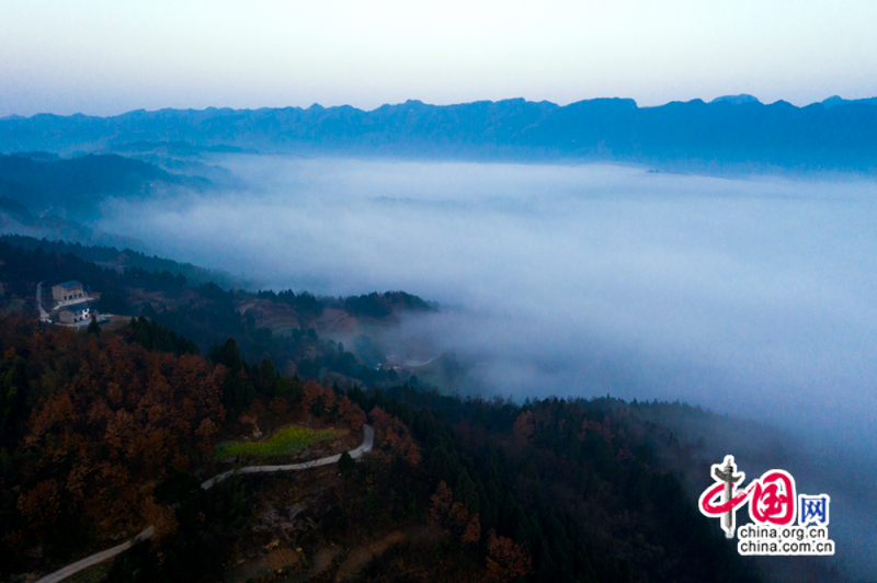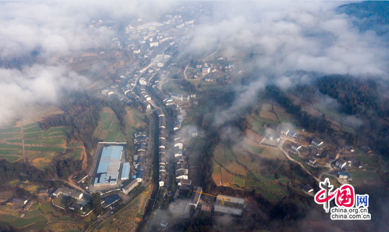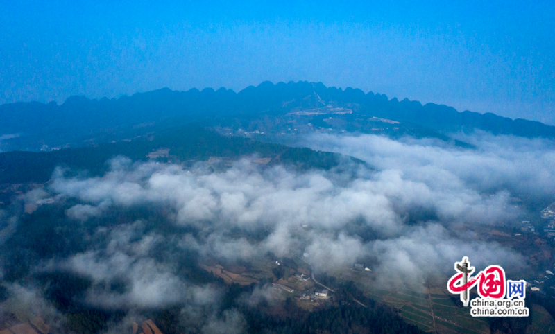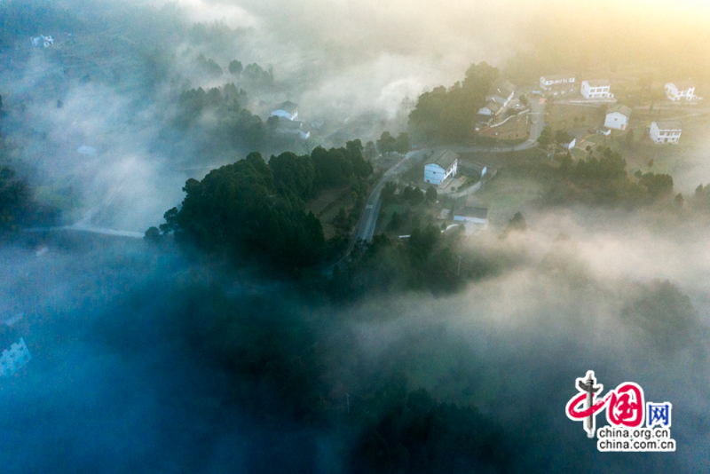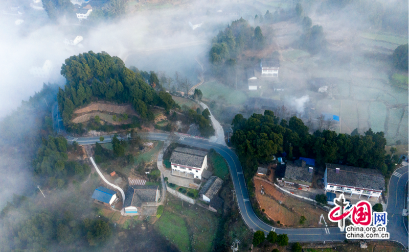 连日大雾晴好天气的早晨,位于四川省天府旅游名县剑阁县国家AAAAA级景区内,连绵起伏的群山中云雾缭绕,山头在雾海中漂浮;村落错落有致,粉墙黛瓦的川北古民居和云雾缭绕的远山相映生辉,像一幅水墨画卷,吸引了众多游客。
