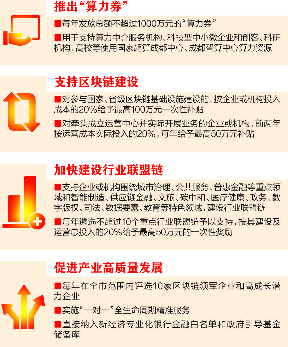 原标题:成都发布全国首个算力产业政策,率先出台区块链专项政策 每年发放1000万元“算力券” 参与区块链建设最高补贴100万元