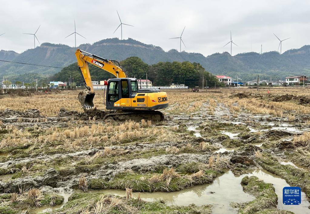 1月14日,在湖南省湘乡市梅桥镇一处高标准农田建设现场,工人驾驶挖掘机平整土地。新华社记者 谢奔 摄