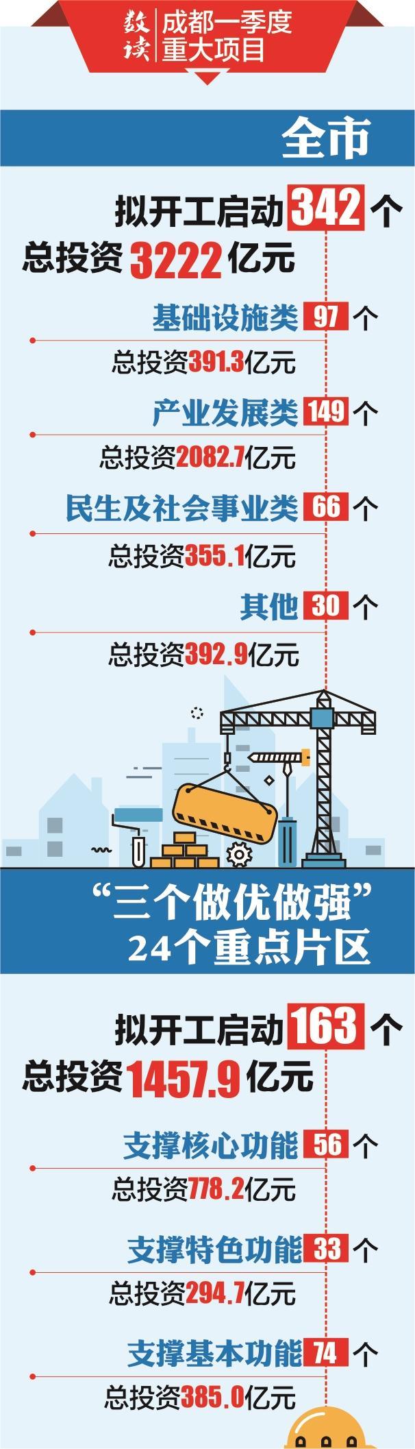 延伸项目统计外延,全市一季度重大项目拟开工启动342个,总投资3222亿元,其中50亿元以上项目9个、总投资695.4亿元,30亿元至50亿元项目19个、总投资733.5亿元。基础设施类有天府大道北延线(濛阳段)等97个项目,总投资391.3亿元;产业发展类有中航锂电50GWh动力电池储能电池成都基地项目二期等149个项目,总投资2082.7亿元;民生及社会事业类有四川省体育运动学校新校区、成都城市音乐厅音艺中心等66个项目,总投资355.1亿元;其他项目30个,总投资392.9元。