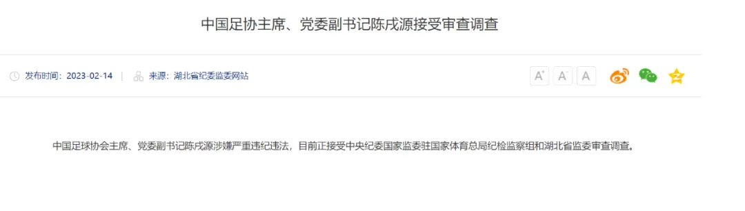 2月14日20时,湖北省纪委监委网站发文通报,中国足球协会主席、党委副书记陈戌源涉嫌严重违纪违法,目前正接受中央纪委国家监委驻国家体育总局纪检监察组和湖北省监委审查调查。