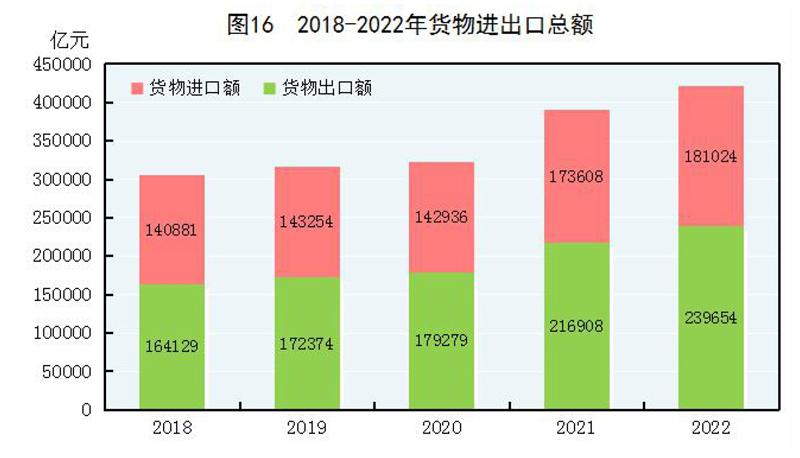 全年货物进出口总额420678亿元,比上年增长7.7%。其中,出口239654亿元,增长10.5%;进口181024亿元,增长4.3%。货物进出口顺差58630亿元,比上年增加15330亿元。对“一带一路”[40]沿线国家进出口总额138339亿元,比上年增长19.4%。其中,出口78877亿元,增长20.0%;进口59461亿元,增长18.7%。对《区域全面经济伙伴关系协定》(RCEP)其他成员国[41]进出口额129499亿元,比上年增长7.5%。
