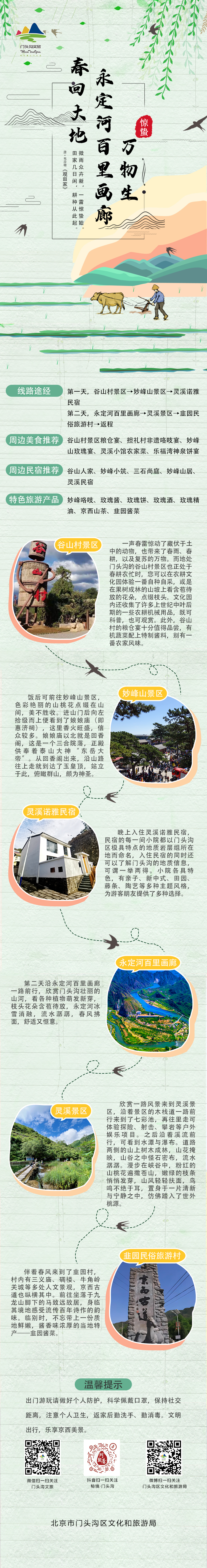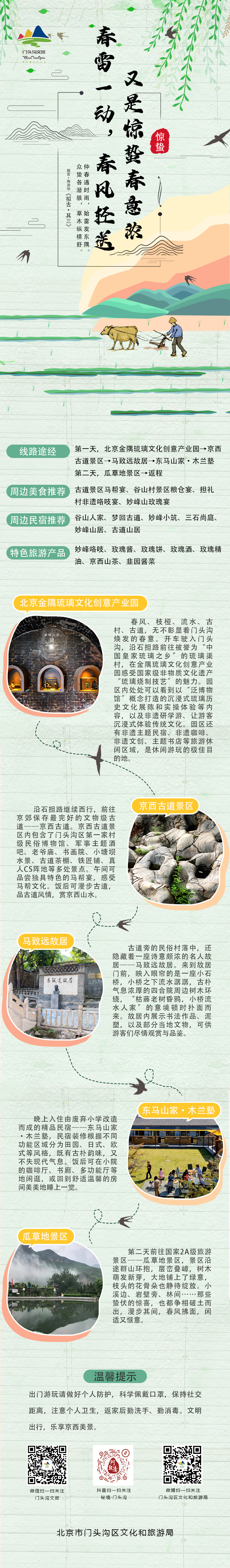 时至惊蛰,春风向暖,永定河畔,万物复苏。门头沟区文旅局围绕“绿水青山绵延相连,三大枢纽龙头引领,区域载体辐射连片,精品民宿镶嵌其间”全域旅游发展思路,在春季美景渐入佳境之际,加大文旅市场产品供给,持续激活春季文旅消费市场,高品质打造永定河文旅体验产业带,以二十四节气——惊蛰为节点,策划推出了4条春季惊蛰精品文旅线路,线路涵盖了门头沟春季踏青赏花、民宿小院、特色美食、古村古寺、生态山水等永定河百里画廊文旅资源,吸引广大游客到门头沟区住小院、赏春景、品美食、游古村古寺,共享门头沟春日好时光,全力打造国际山地旅游目的地、国际山地运动打卡地和京津冀微度假首选地。
