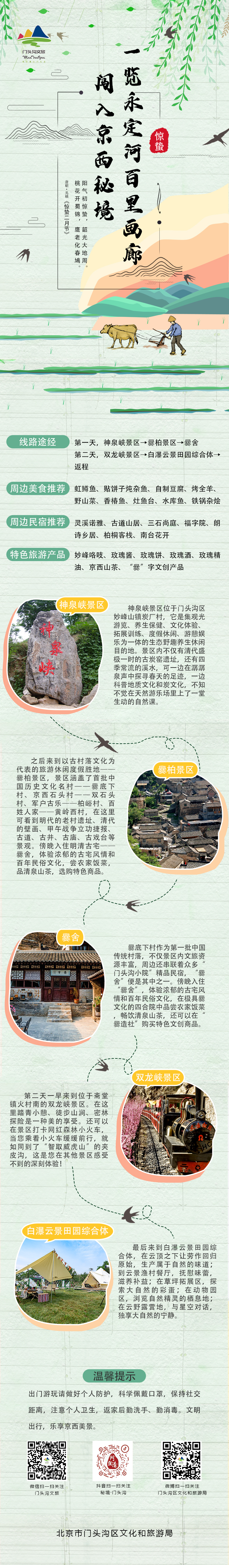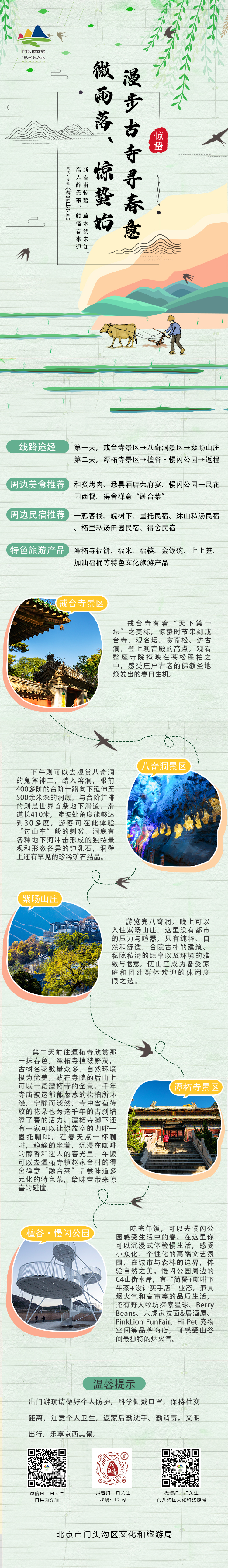 漫漫山川终有色,一抹春风抚春响。在千年古刹戒台寺观奇松,听钟鸣,感受春日的别样古刹禅韵;到八奇洞打卡壮观的天然溶洞,欣赏大自然的鬼斧神工;宿紫旸山庄,煮一壶热茶,泡一池暖汤,享山谷间的雅致与惬意;看千年古寺潭柘寺被松柏环绕,红墙碧瓦,禅意浓浓;去檀谷·慢闪公园沉浸式体验慢生活,体验自然之美;在谷山村品尝特色粮仓宴,看老式农具,追忆童年时光;去妙峰山俯瞰群山,看山花点缀其中;到灵溪诺雅体验特色主题小院,科普地质文化;沿京西百里画廊去灵溪景区探寻山谷之中的怪石嶙峋,看流水潺潺;到韭园村感受古道风情,购买特色酱菜;在金隅琉璃文化创意产业园沉浸式体验传统文化,感受国家级非物质文化遗产“琉璃烧制技艺”的魅力;去京西古道赏古道风情,看京西山水;到马致远故居感受“枯藤老树昏鸦,小桥流水人家”的意境;于东马山家·木兰塾喝一杯咖啡,静享春日的闲适;在神泉峡景区探寻春天的足迹,科普自然知识;到爨柏景区漫步古村古道,感受独特“爨”文化;去双龙峡景区打卡网红小火车,漫步峡谷秘境;在白瀑云景品尝灶台鱼,抚慰味蕾,独享大自然的宁静。