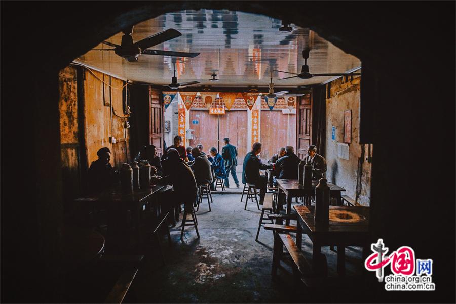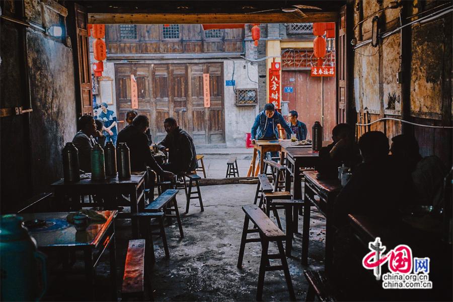 在古镇的街巷,茶馆是很多见的,昏暗的灯光、三片叶片式的旋转吊扇、斑驳的墙体上贴着喜字和古老的画,喝茶的人们与茶馆构成里古镇最悠闲的生活场景,他们聚在一起拉家常、打麻将,融入其间,与热情的古镇居民聊聊天,还会被邀喝盏茶或入局牌局,感受古镇闲适的慢时光,茶馆、老人在缓缓流淌的岁月中讲述着关于他们和古镇的故事。