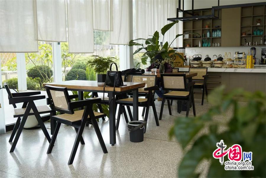 雍溪古镇上有一间以川剧主题为特色的民宿,一楼是装修古朴且现代的茶馆,二楼是房间,紧邻河边的露台,可眺远山与油菜花田,为想在古镇小住的游客提供服务。