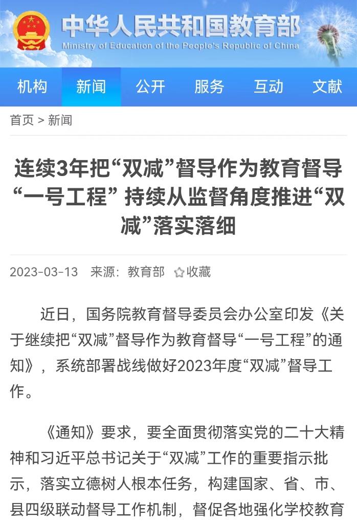 记者3月13日从教育部获悉,国务院教育督导委员会办公室近日印发了关于继续把“双减”督导作为教育督导“一号工程”的通知,对2023年度“双减”督导工作进行部署。通知指出,各地要在前两年工作的基础上,建立健全“双减”督导工作机制,在履行督政、督学、评估监测职能中,创新方式方法,切实发挥教育督导的监督作用,实现以督促减、以督增效。