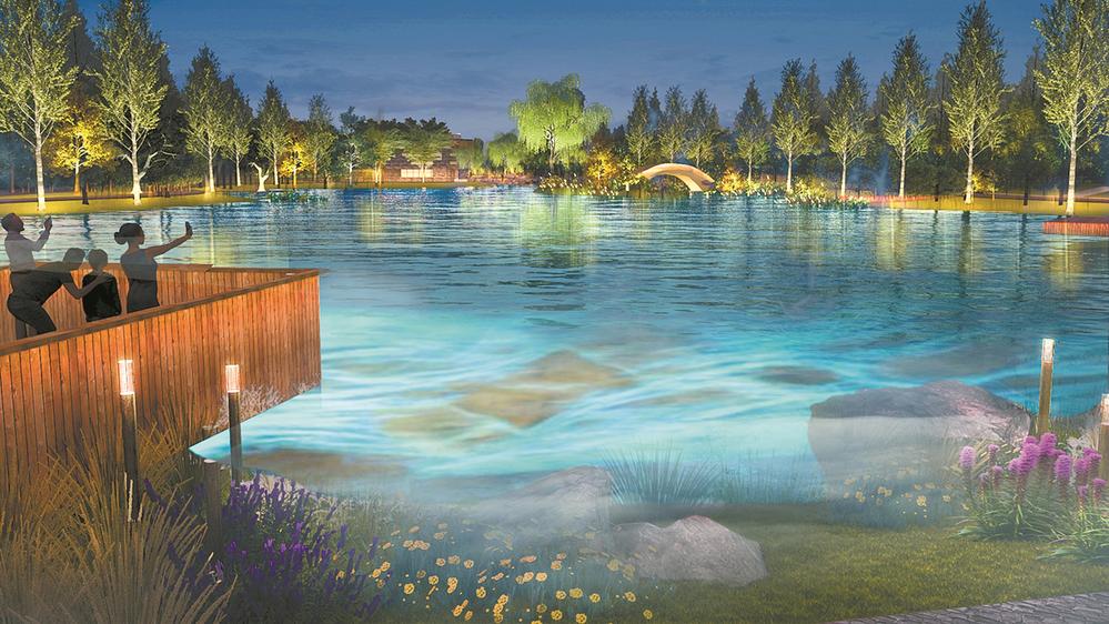 林泽水韵区定位于自然古蜀文化林水乐园,打造2.8公里古蜀治水游线,通过野趣植物科普园与古蜀水乐园,科普蜀地从治水向乐水的转变故事。同时结合现状内湖湿地,丰富亲水、戏水、观水多样化体验,打造文化感知与亲水互动兼具的水上主题游乐区。