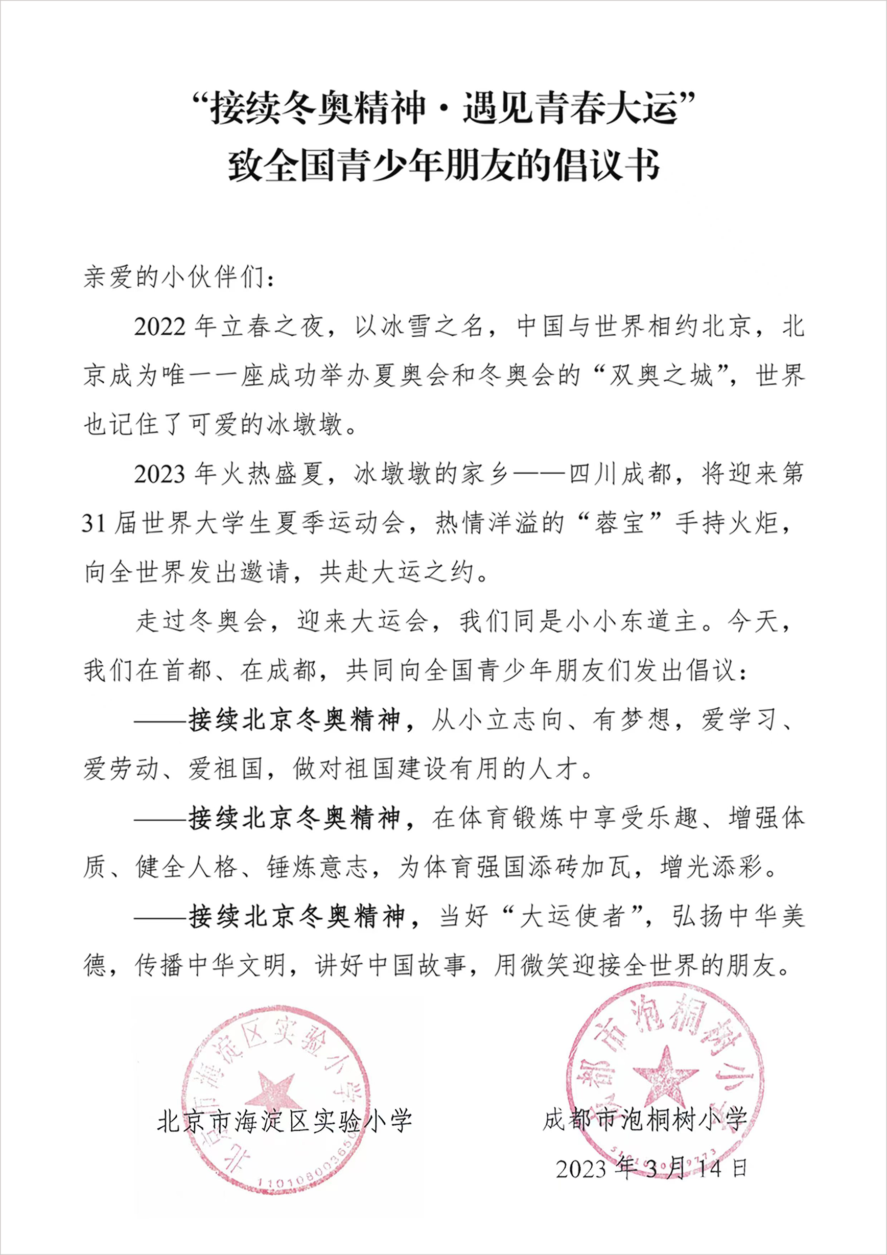 运动不但拉近了人们心与心的距离,两座因体育被世界瞩目的城市“小主人”们也因此结缘。3月14日上午,在成都大运会筹办进入紧锣密鼓的冲刺阶段之际,来自北京市海淀区实验小学和成都市泡桐树小学的多名小学生联合发出“接续冬奥精神·遇见青春大运”倡议书,号召更多青少年接续冬奥精神,相约大运盛会,为建设体育强国添砖加瓦,增光添彩。