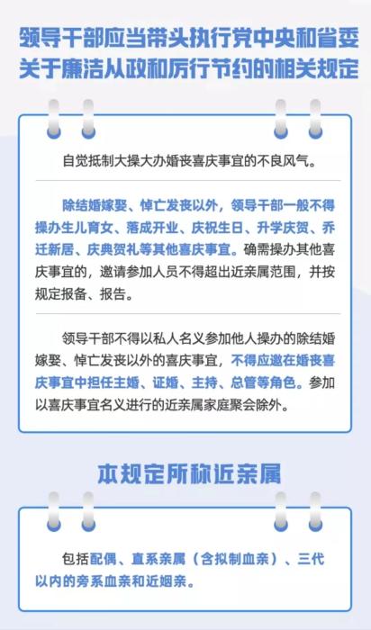 《规定》明确,领导干部除结婚嫁娶、悼亡发丧以外,一般不得操办生儿育女、落成开业、庆祝生日、升学庆贺、乔迁新居、庆典贺礼等事宜。领导干部操办婚丧喜庆事宜应当秉持勤俭节约理念,并事前报备、事后报告操办情况。