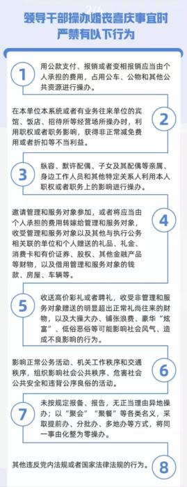 值得注意的是,8项严禁行为中还包括严禁未按规定报备、报告,无正当理由异地操办;以“聚会”“聚餐”等名义,采取提前办、分批办、多地办等方式,将同一事由化整为零操办。
