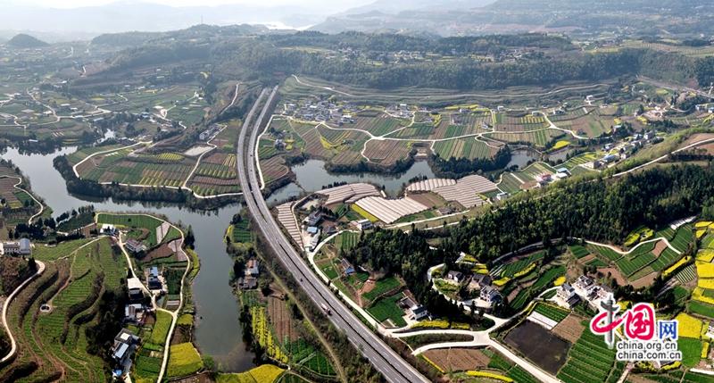 远山含黛,流水有情,油菜花竞芳,一幅美丽清新的田园诗画。