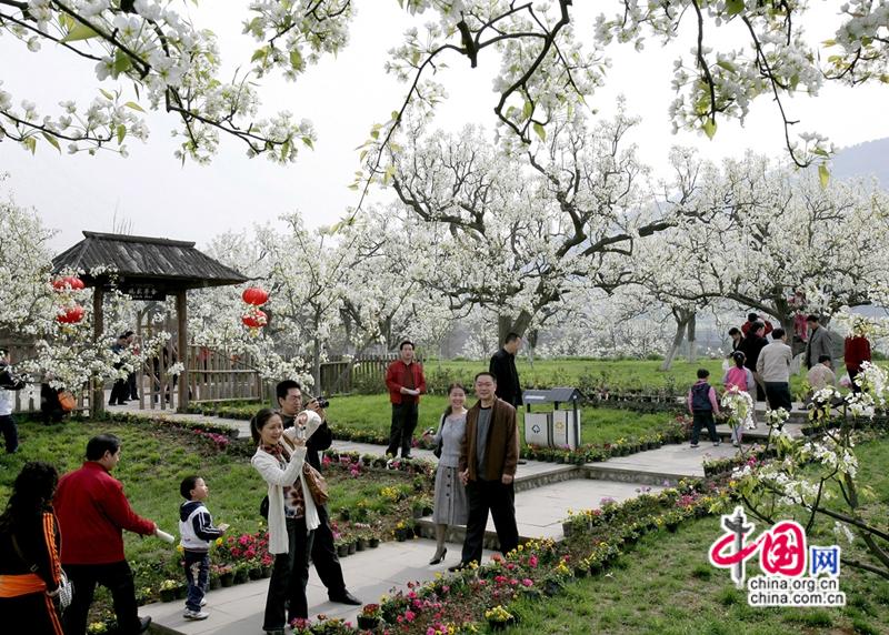梨花在轻柔的春风迅猛地绽放,人们陶醉在梨花的世界里。