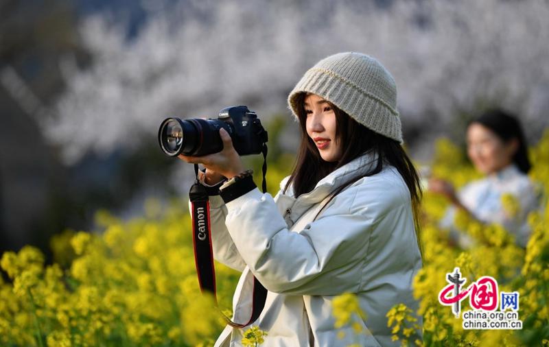 漫山遍野的油菜花,铺展成光芒四射的黄金地毯;如织的游人,游弋在娇艳画中。