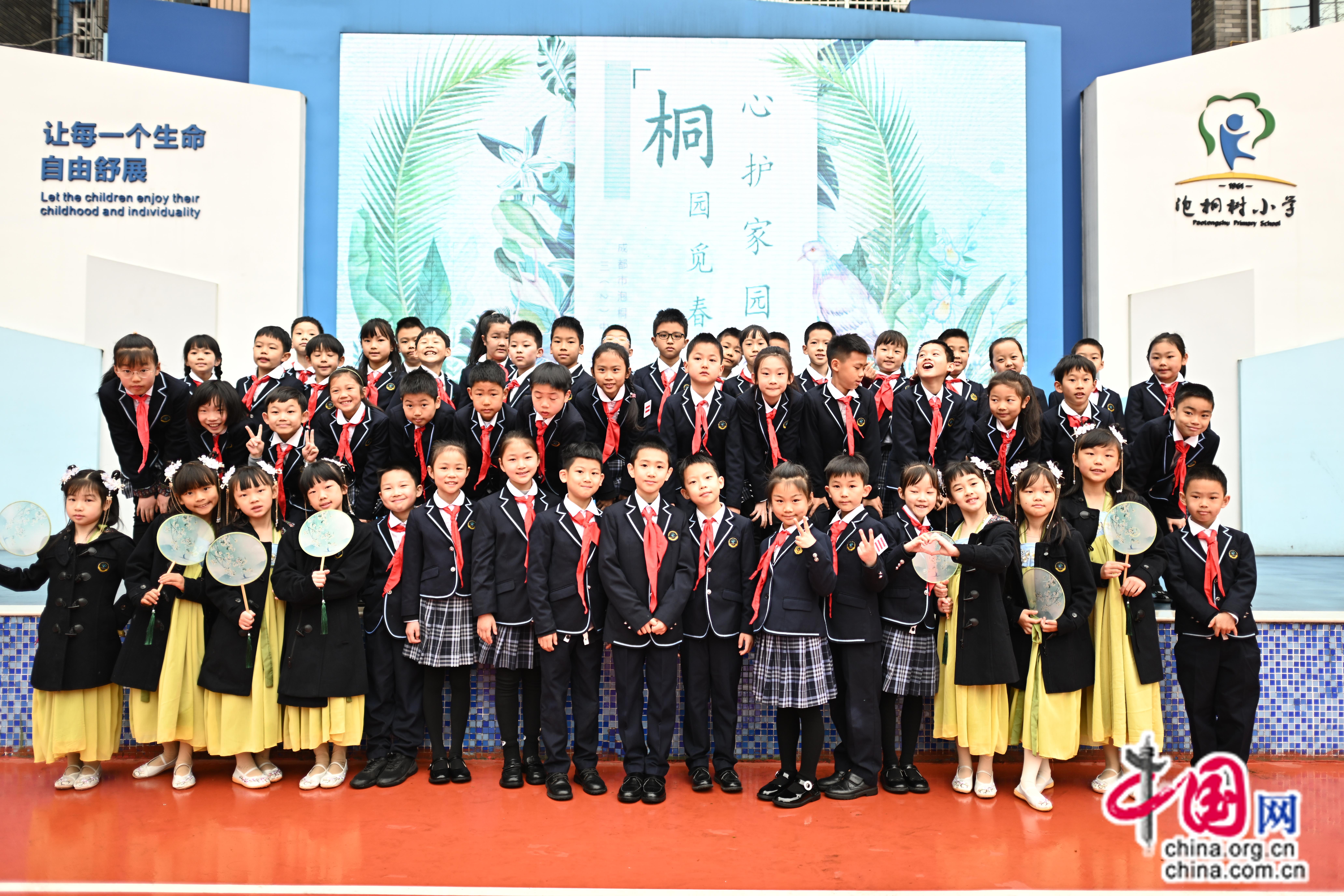 3月20日是成都大运会倒计时130天,也即将迎来中国传统二十四节气中的春分。当天早上,成都市泡桐树小学三(二)中队以“惊蛰黄河开,昼夜此相停”的字谜揭开帷幕,开启了“‘桐’园觅春分、‘桐’心护家园”主题的国旗下活动。