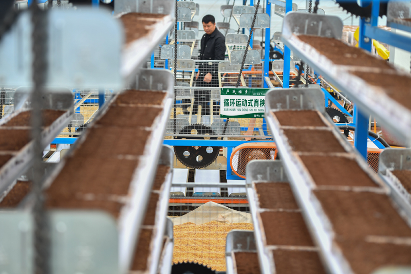 3月23日,在湘潭市雨湖区姜畲镇青亭村一处多功能育秧大棚里,农民查看循环运动式育秧机的运行情况。