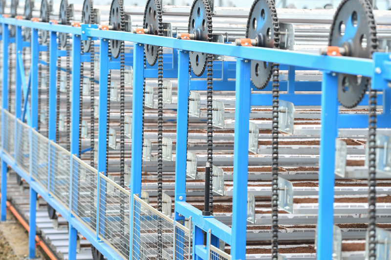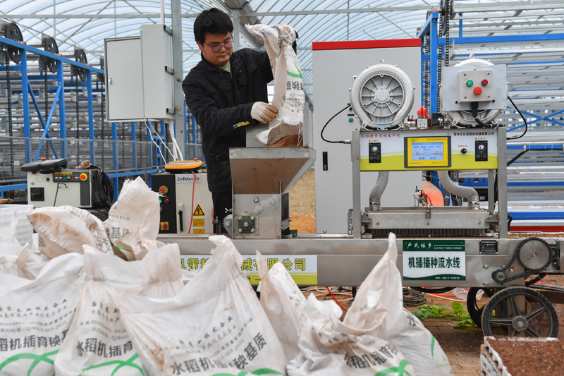 3月23日,在湘潭市雨湖区姜畲镇青亭村一处多功能育秧大棚里,循环运动式育秧机在作业。