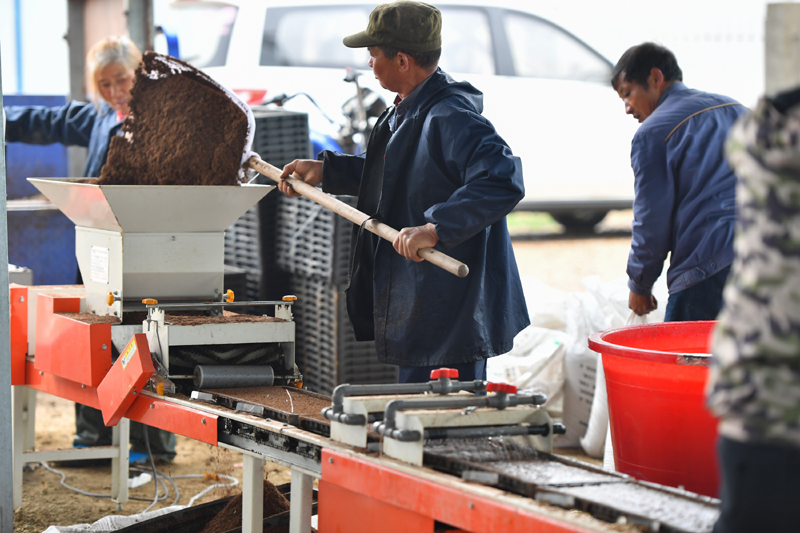 3月23日,在湘潭市雨湖区姜畲镇青亭村,农民使用水稻秧盘育秧播种机制作秧盘。