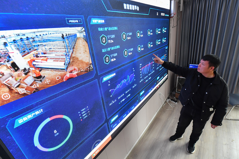3月23日,在湘潭市雨湖区姜畲镇青亭村一处多功能育秧大棚里,农民在手机上设置智能水肥一体化系统。