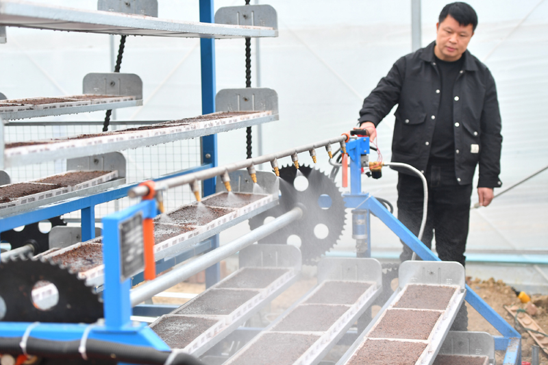 3月23日,在湘潭市雨湖区姜畲镇青亭村一处多功能育秧大棚里,循环运动式育秧机在进行喷淋。
