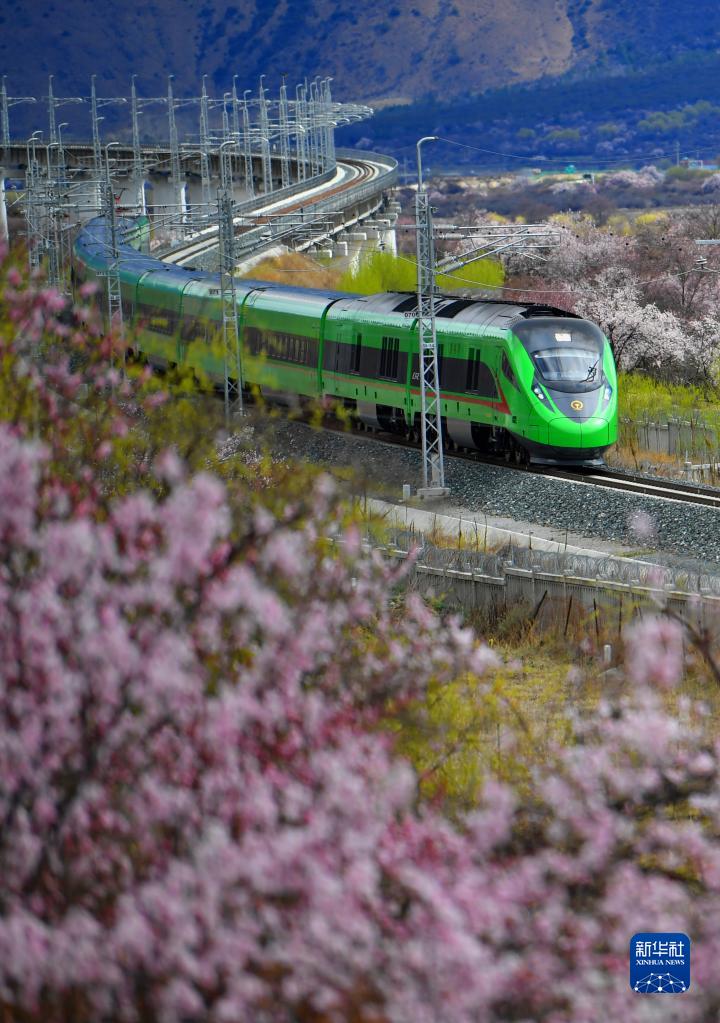 复兴号穿行在西藏拉林铁路林芝段的桃花间(2023年3月21日摄)。新华社记者 觉果 摄