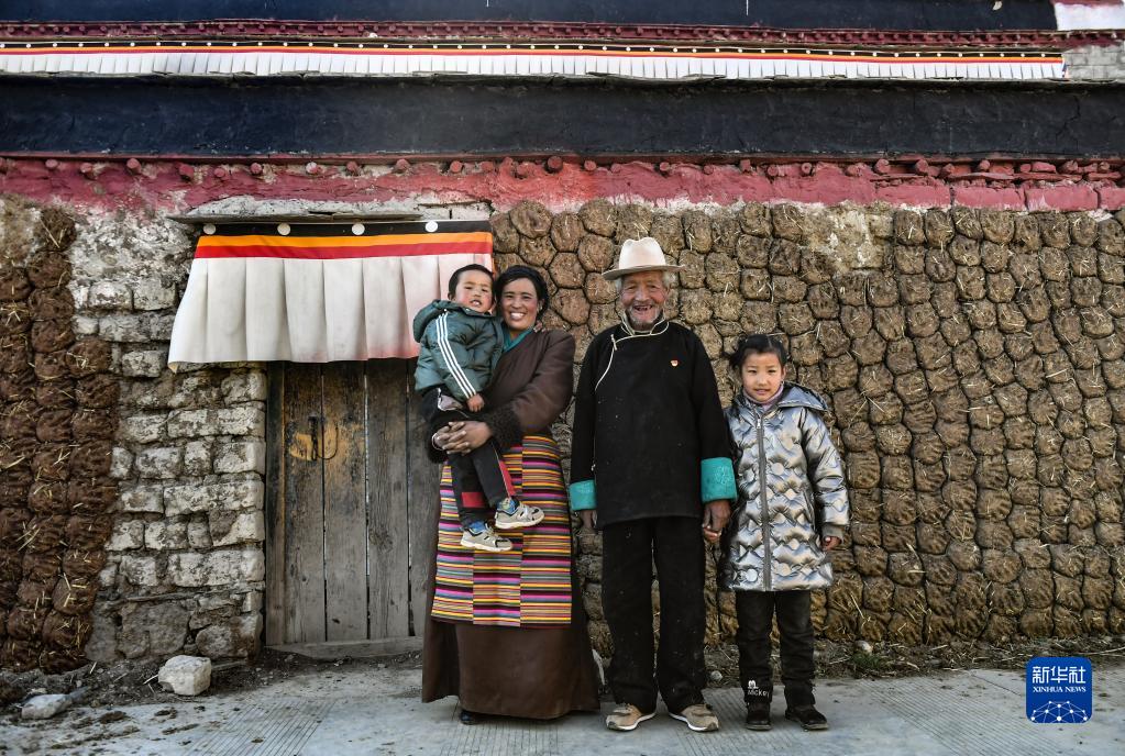 达国杰(右二)和家人在家门前合影(2021年3月22日摄)。新华社记者 孙瑞博 摄