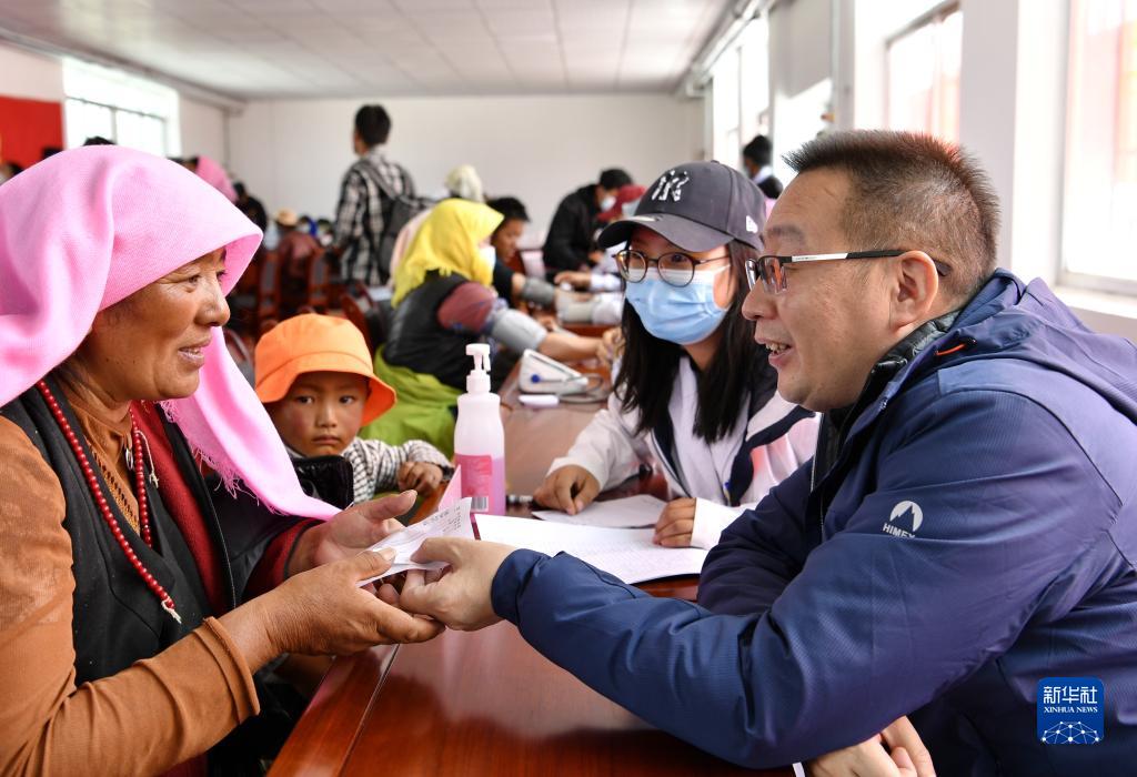 北京市第七批“组团式”援藏医疗队专家、拉萨市人民医院副院长汪红兵(右)为居民义诊(2022年6月9日摄)。新华社记者 张汝锋 摄